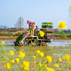 4月1日,江西省九江市都昌县蔡岭镇杨湾村,农民驾驶农机在田间机插早稻。