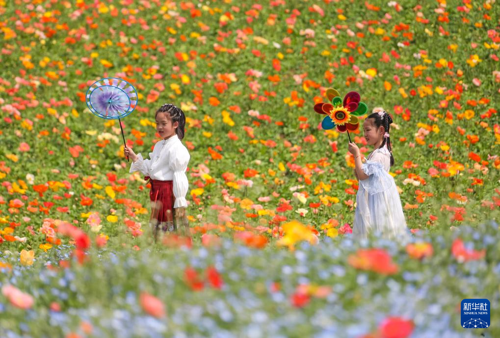 4月4日,小朋友在江苏省句容市白兔镇伏热花海玩耍。