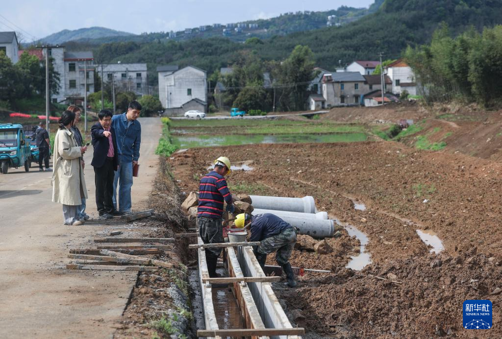 4月4日,十里坪村党总支书记卓任翔(中)带领郦泱泱、冯贝贝、周烨踏勘春耕备耕现场以及农用设施建设进度。