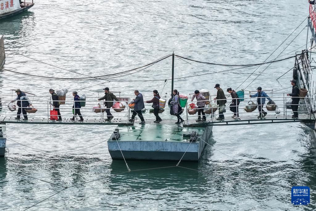 3月31日,“新渝忠客2180”客轮抵达忠县县城后,菜农下船前往集市售卖农特产品(无人机照片)。