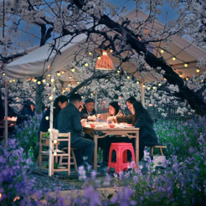 3月30日,游客在砀山县梨小萌欢乐梨园品尝梨园火锅。