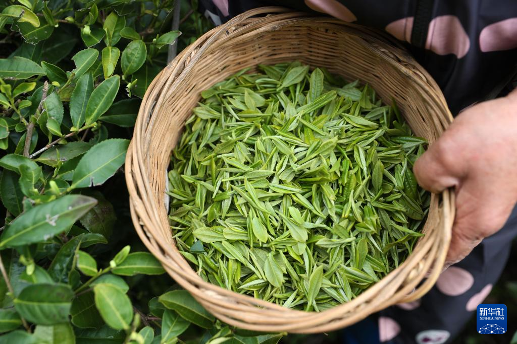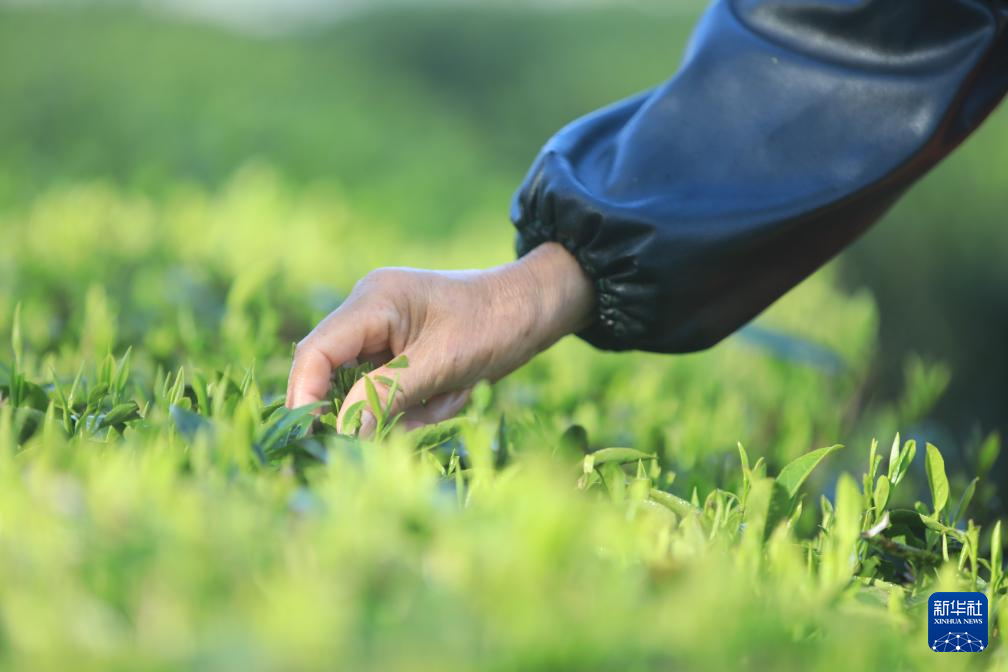 4月4日,茶农在重庆市秀山土家族苗族自治县梅江镇兴隆坳现代农业园区茶叶基地采茶。