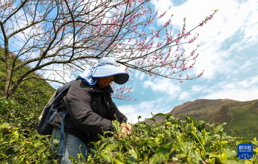 4月3日,村民在贵州省都匀市毛尖镇坪阳村茶山采摘明前茶。