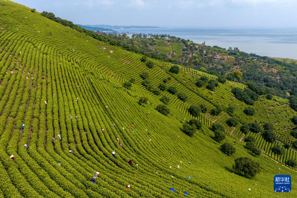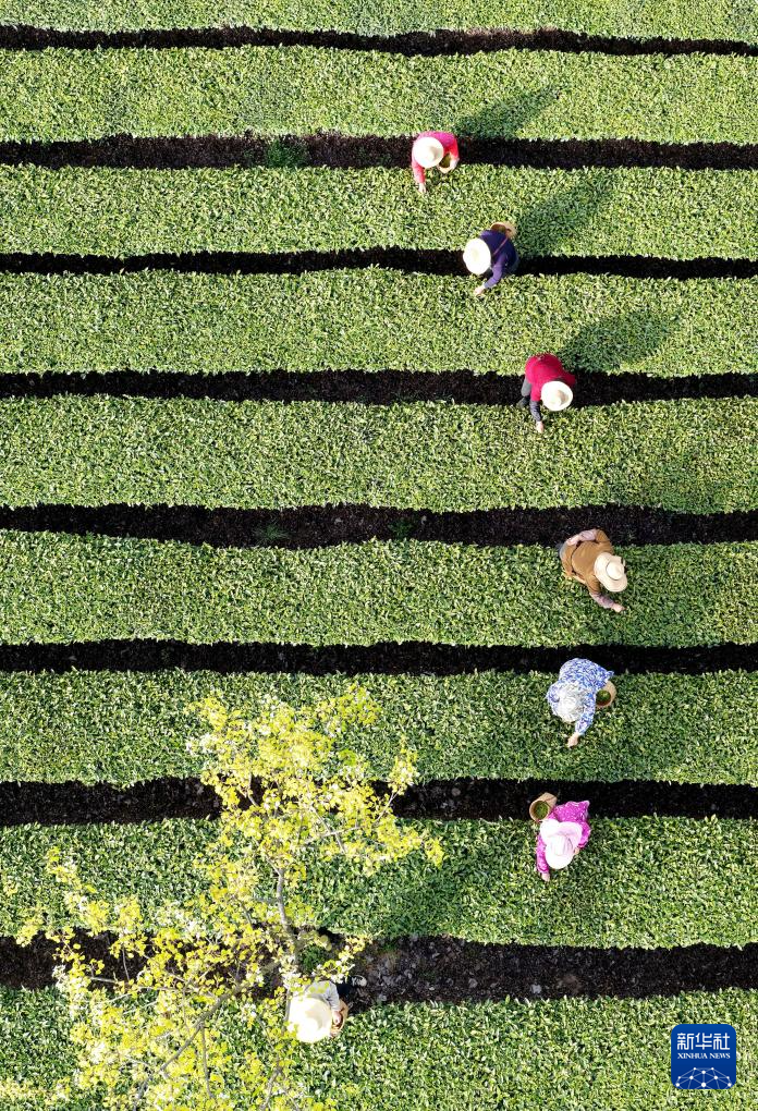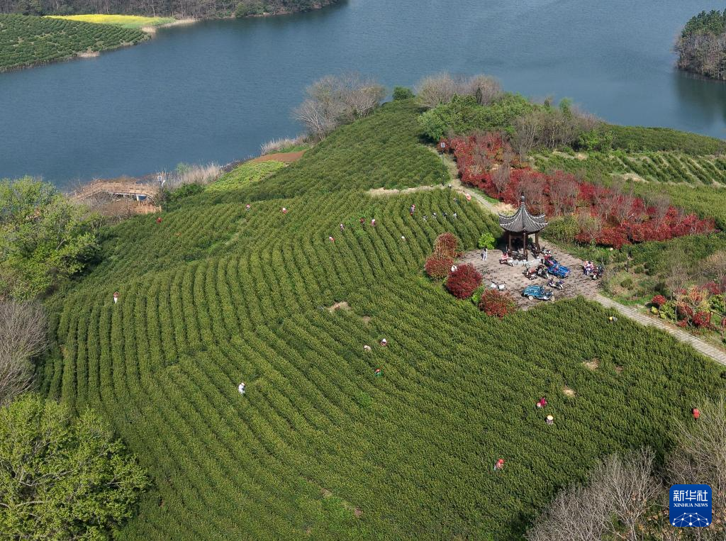 4月2日,茶农在安徽省合肥市巢湖市苏湾镇的茶园里采茶(无人机照片)。