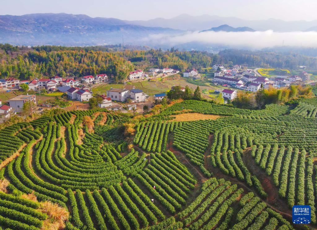 4月4日,在湖南省衡山县开云镇,村民在茶园摊晒春茶(无人机照片)。