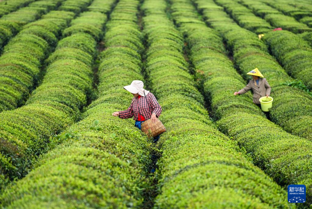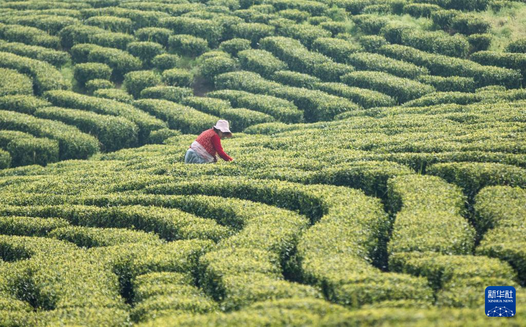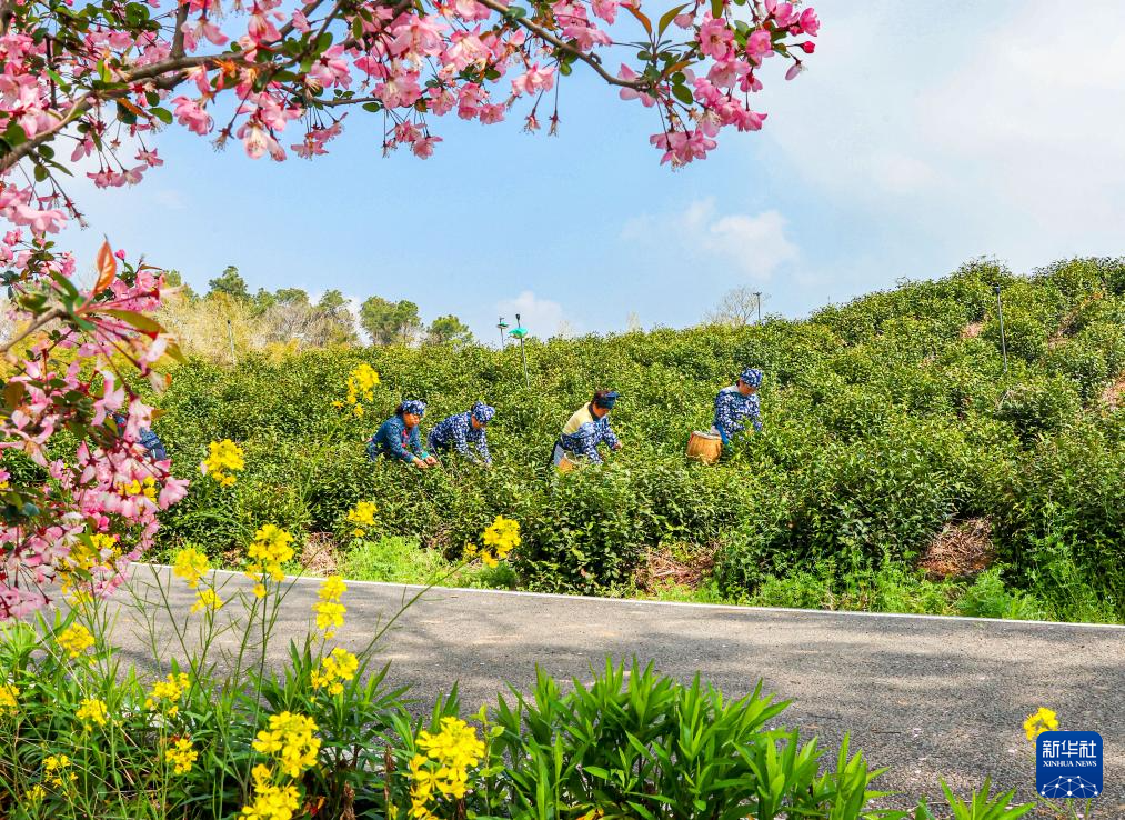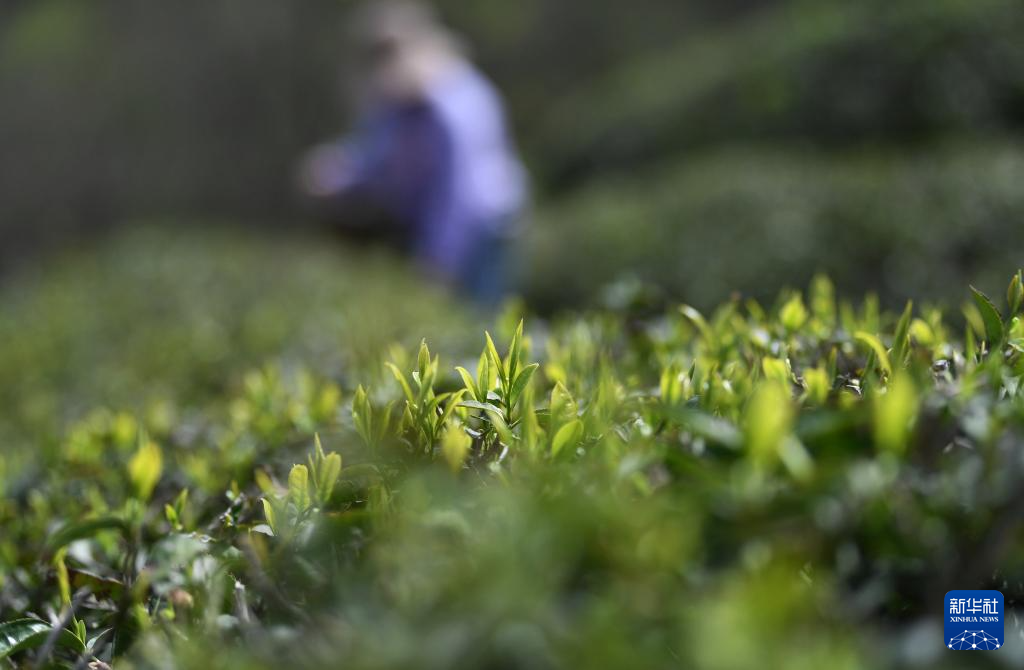 4月4日,茶农在江西省九江市都昌县徐埠镇生态茶园采摘春茶。