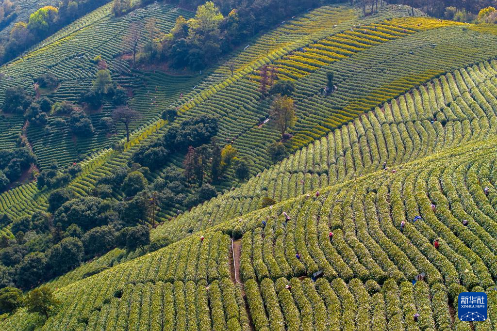 4月4日,采茶工在浙江省湖州市长兴县夹浦镇父子岭村的茶山中采摘明前茶(无人机照片)。