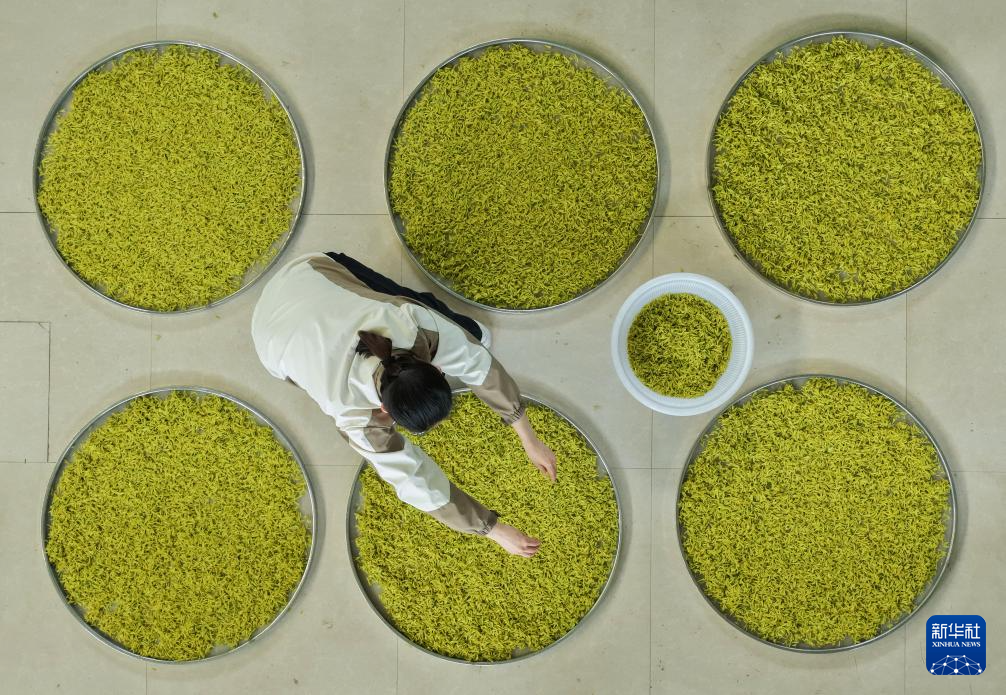4月4日,在浙江省乐清市雁荡镇能仁村,茶工在进行摊青作业。