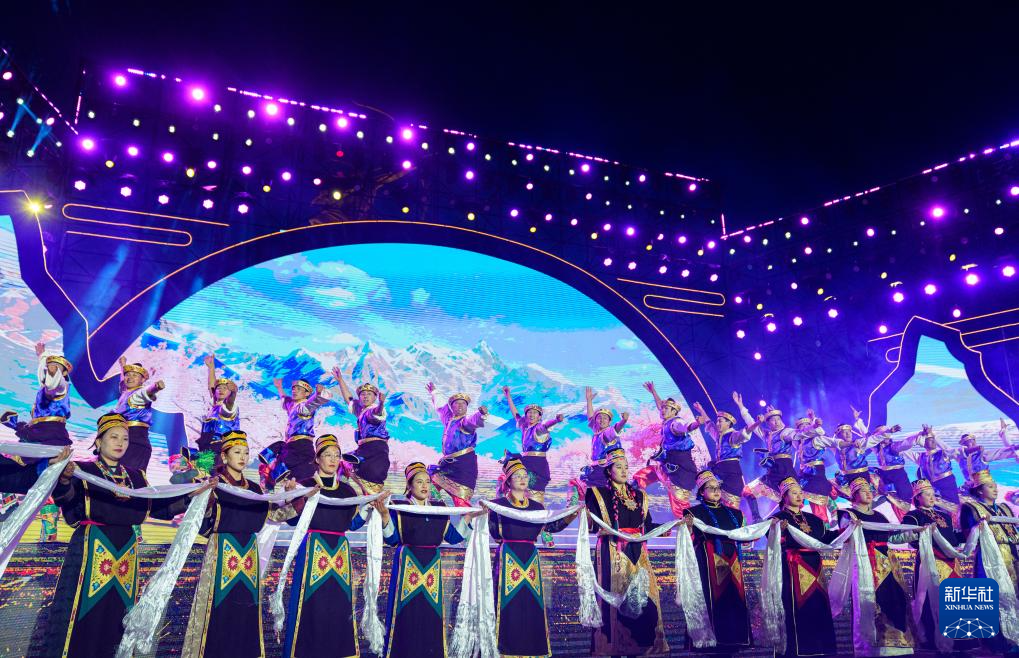 这是4月3日拍摄的林芝第二十三届桃花旅游文化节开幕式文艺演出现场。