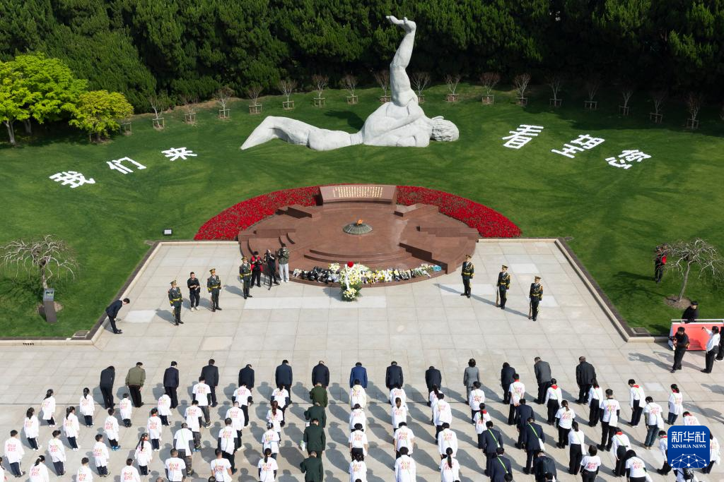 4月5日,武汉市武昌区滨江实验第一小学师生、武汉客运段乘务员代表在武汉二七纪念馆开展祭奠先烈活动(无人机照片)。