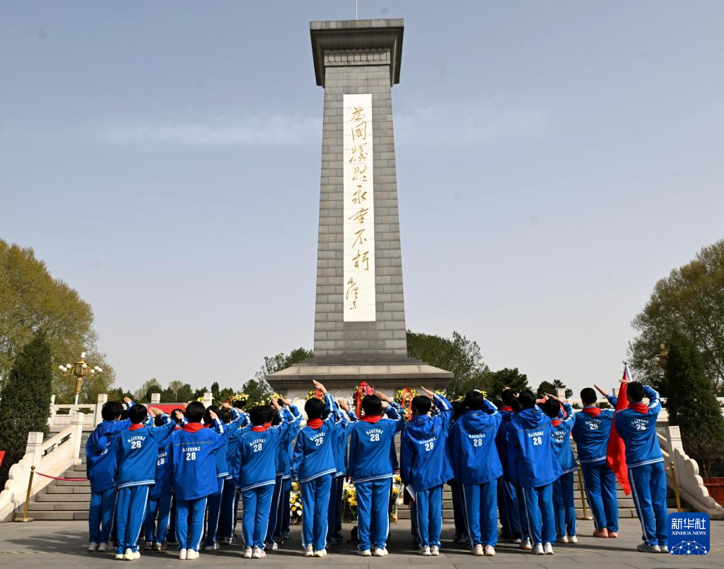 4月5日,在位于河北省石家庄市的华北军区烈士陵园,石家庄市第二十八中学学生开展祭奠英烈活动。