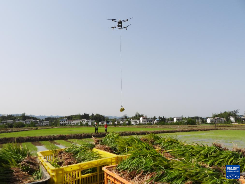 4月5日,在四川省达州市达川区万家镇迎风村邓家坝田间,无人机在进行水稻秧苗空运作业。