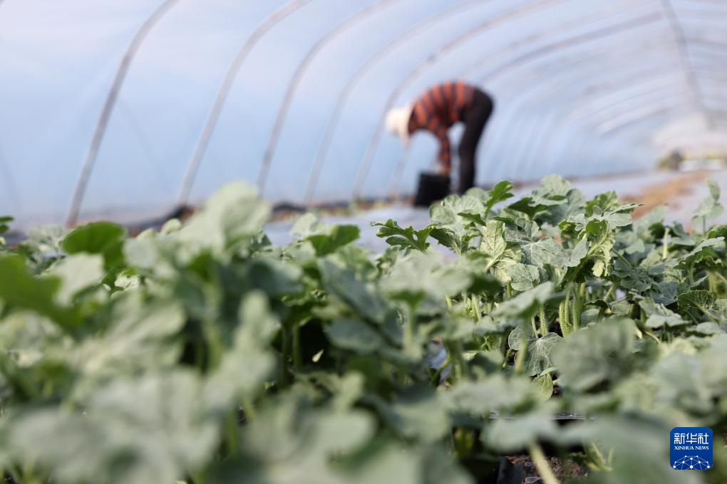 4月5日,在江苏省淮安市洪泽区三河镇,农民在西瓜种植大棚里栽植西瓜苗。