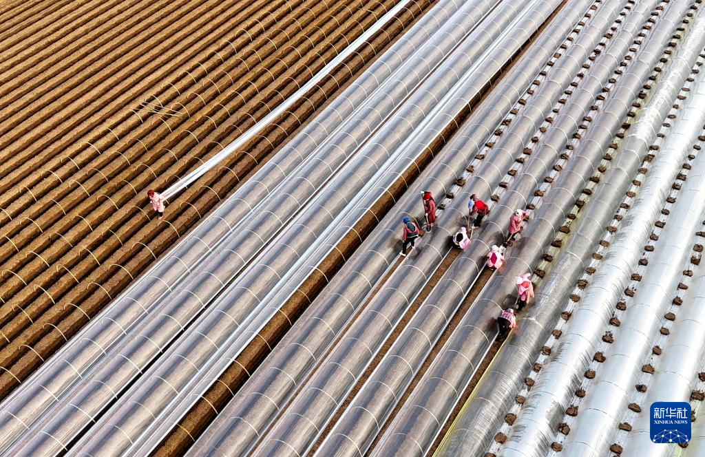 4月5日,河北省石家庄市栾城区西营乡南贾村农民在搭建鲜姜拱棚(无人机照片)。