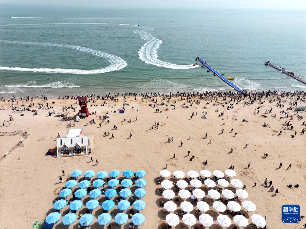 4月5日,游客在江苏省连云港市连岛景区大沙湾海滨浴场休闲游玩(无人机照片)。