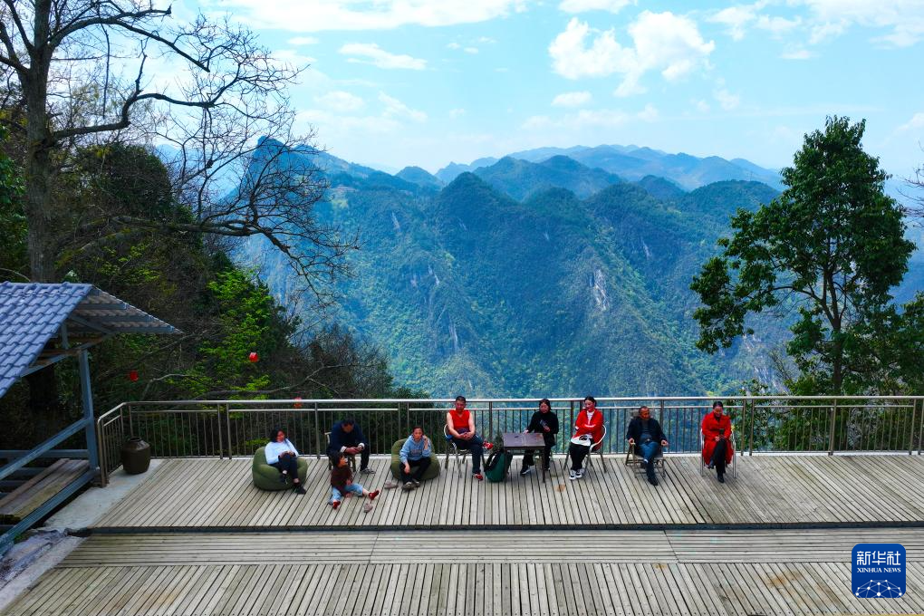4月4日,游客在重庆市黔江区阿蓬江镇柒坨村五岭山露营基地观景台游玩(无人机照片)。