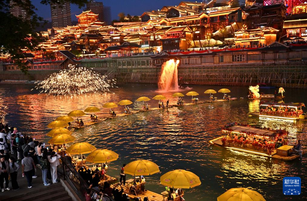 4月4日,湖北省宣恩县城贡水河上进行的火壶和打铁花表演吸引众多游客观赏。