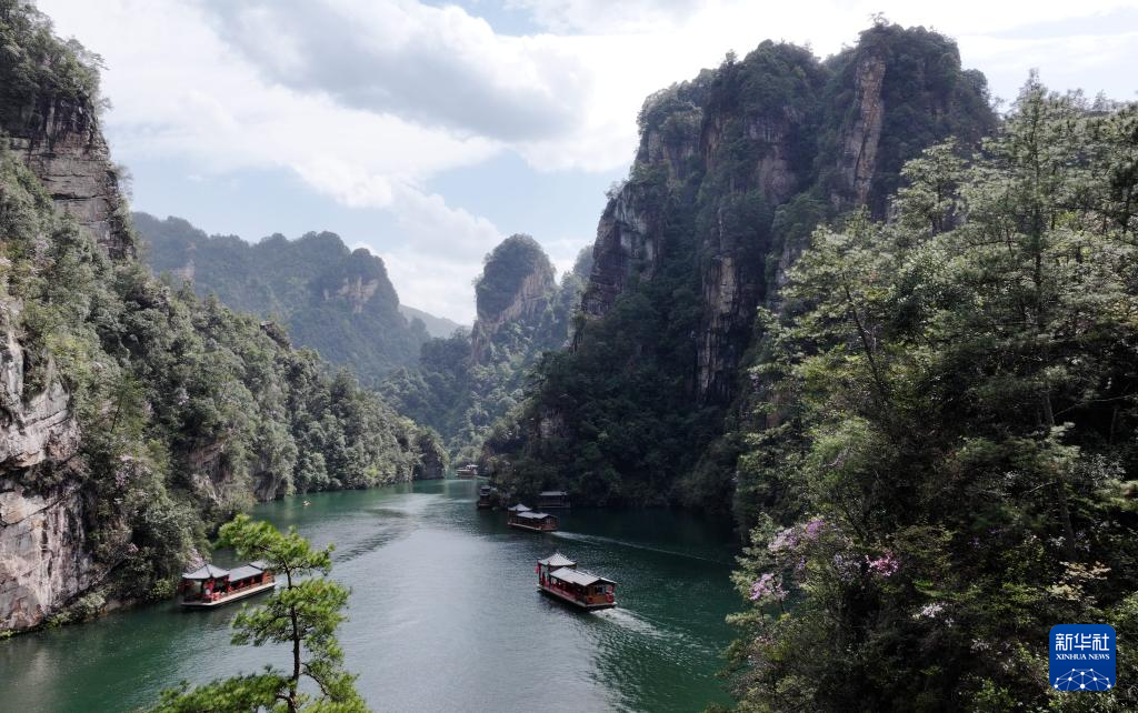 4月4日,游客乘船在湖南张家界宝峰湖景区游玩(无人机照片)。
