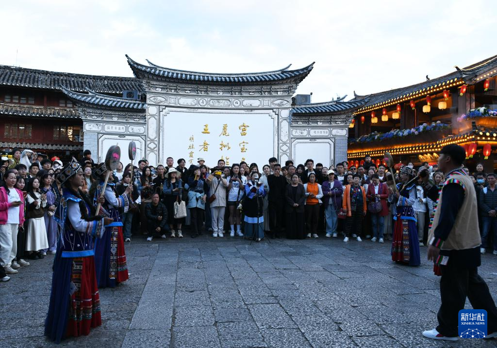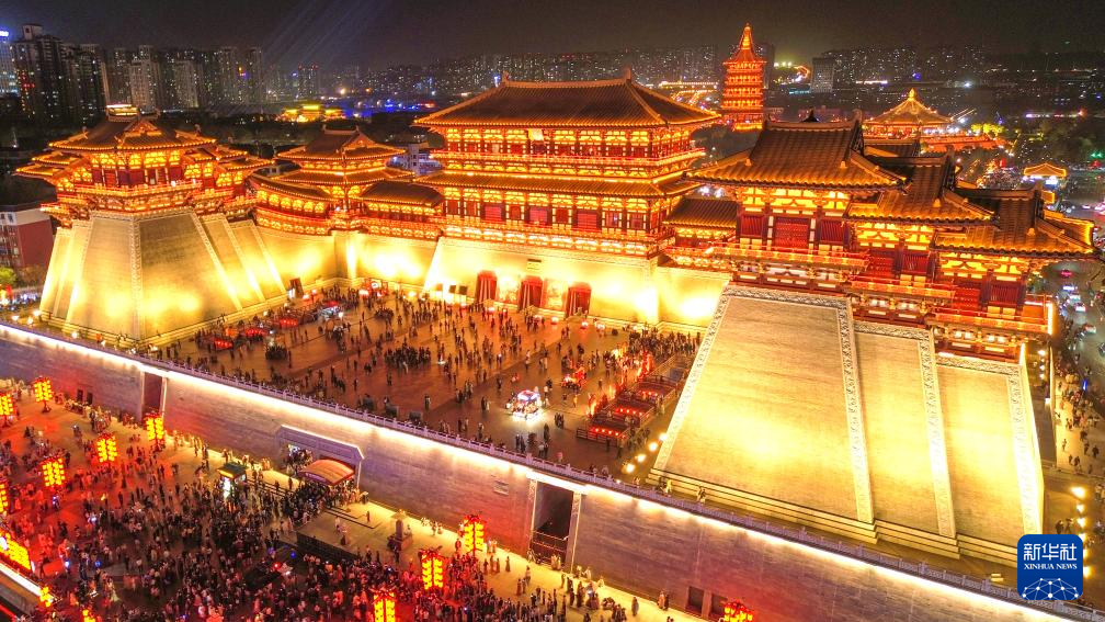 4月5日,游客在湖北省襄阳市盛世唐城景区观看鳌鱼巡游(无人机照片)。