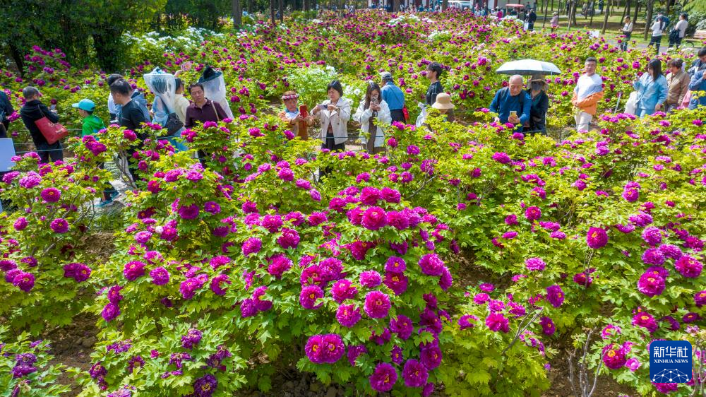 4月5日,游客在河南省洛阳市观赏牡丹花(无人机照片)。