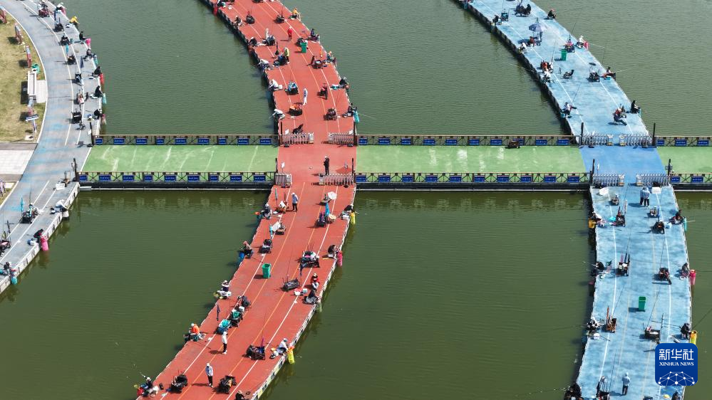 4月4日,垂钓爱好者在江苏省泗洪洪泽湖国际垂钓中心大圆塘参加钓鱼比赛(无人机照片)。