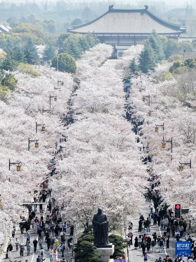 4月4日,游客在江苏省扬州市鉴真路上的“樱花大道”赏花游玩(无人机照片)。