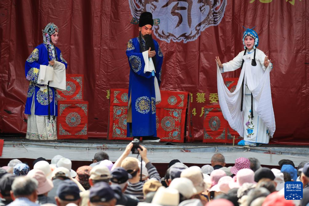 4月5日,河南省许昌市豫剧团的演员在鄢陵县张桥镇屈庄村演出豫剧《投衙》。