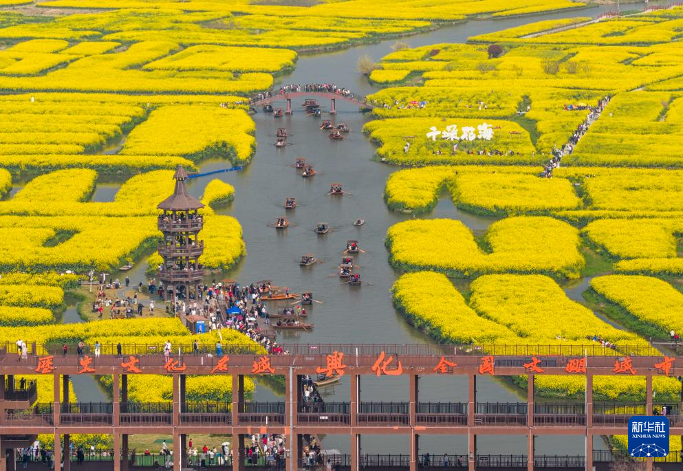 4月4日,游客在江苏省兴化市千垛景区赏花游玩(无人机照片)。
