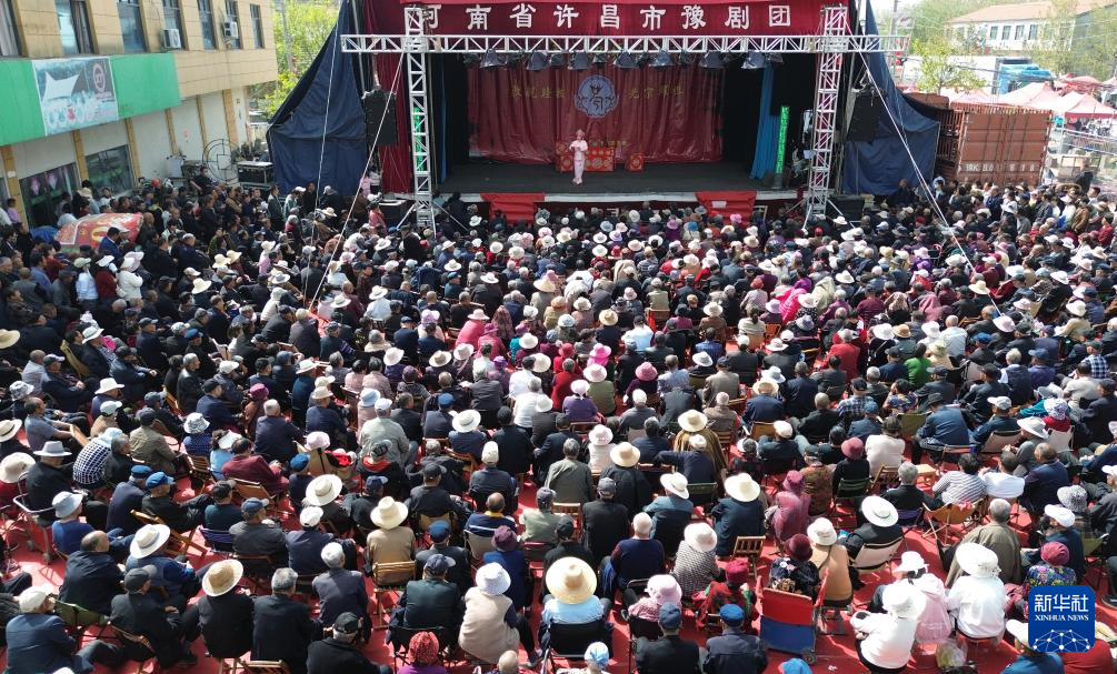 4月5日,在河南省许昌市鄢陵县张桥镇屈庄村,观众观看许昌市豫剧团“送戏下乡”演出(无人机照片)。