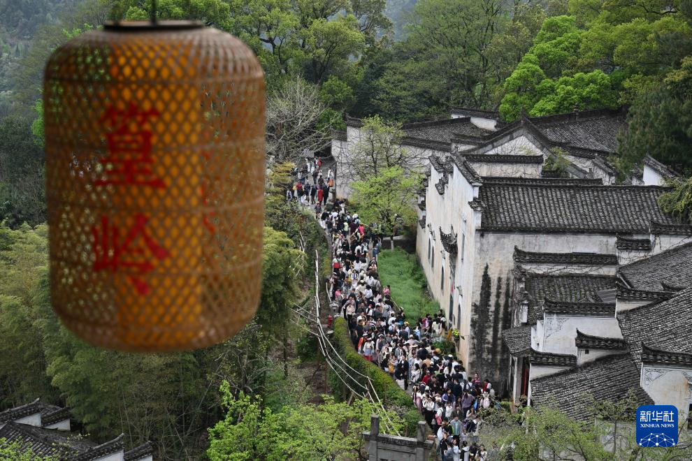 4月4日,游客在江西省婺源县篁岭古村内游览。