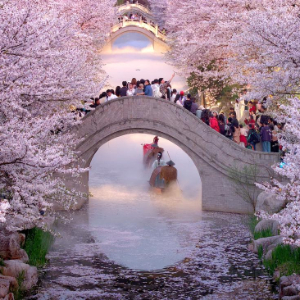 4月5日,游客在江苏南通洲际梦幻岛欣赏樱花河(无人机照片)。