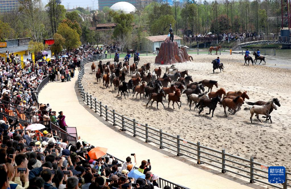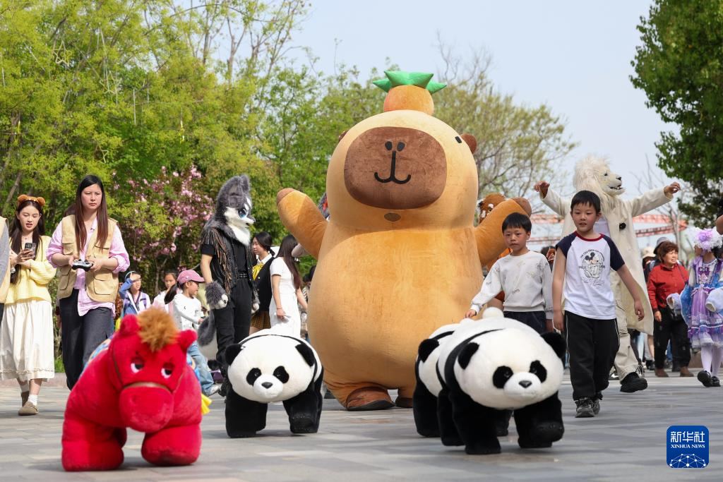 4月4日,游客在湖北省襄阳市华侨城奇幻谷景区观看神奇动物大迁徙巡游表演。