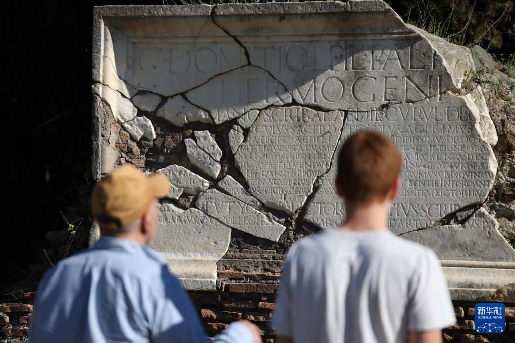 4月5日,游客在意大利罗马的奥斯蒂亚古城遗址游览。