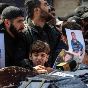 4月9日,在加沙地带中部代尔拜拉赫一所医院,巴勒斯坦民众参加遇难记者的葬礼。