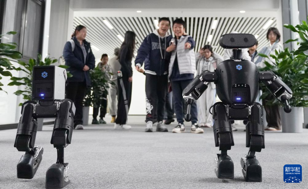 4月9日,学生在石景山人形机器人数据训练中心参观机器人数据训练。