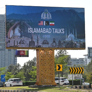 这是4月10日在巴基斯坦伊斯兰堡拍摄的美伊会谈的大型户外广告牌。
