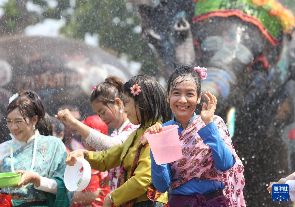 4月10日,在泰国大城府,人们与大象互相“泼水”,迎接即将到来的宋干节。