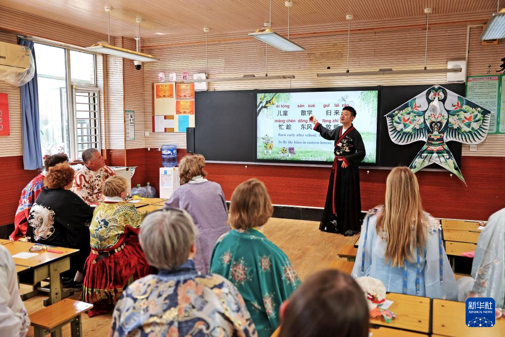 4月11日,美国学生在石家庄外国语学校学习中国古诗。