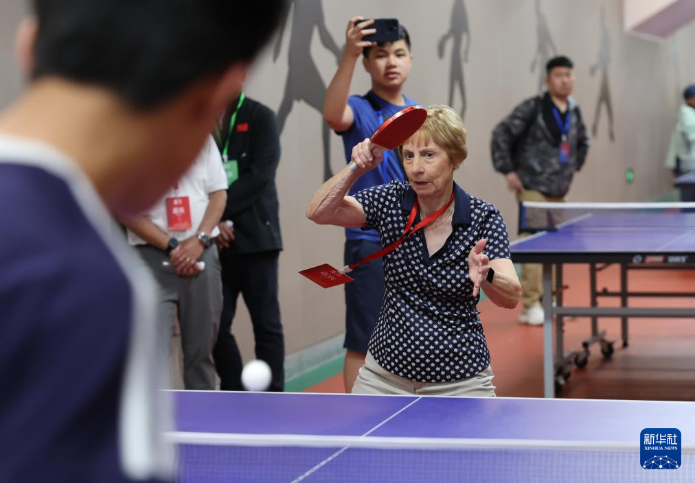 4月11日,中美“乒乓外交”亲历者康妮·史维利斯在石家庄外国语学校与学生进行乒乓球友谊赛。
