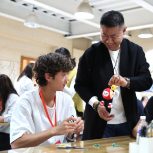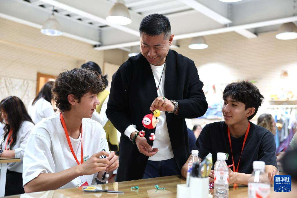 4月11日,美国学生在石家庄外国语学校体验手工课。