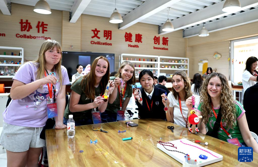 4月11日,美国学生在石家庄外国语学校展示手工课作品。