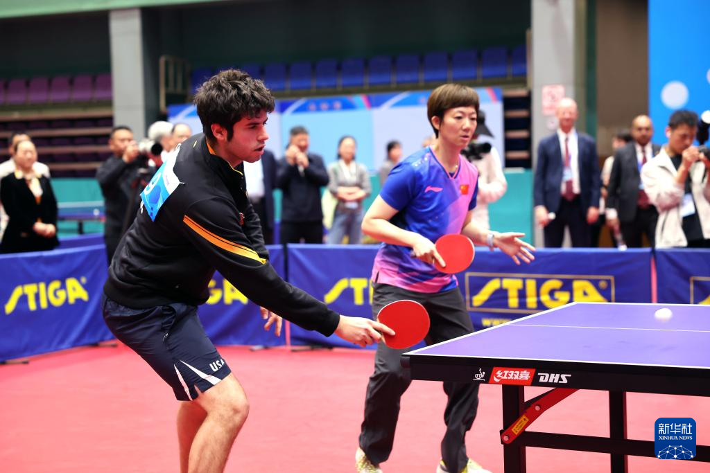 4月11日,参加活动的运动员、体育界人士在河北正定国家乒乓球训练基地进行乒乓球友谊赛。