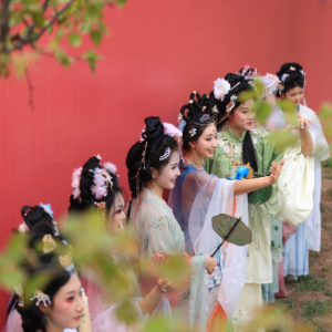 4月11日,在甘肃省皋兰县什川镇百年梨园内,汉服爱好者游玩赏花。