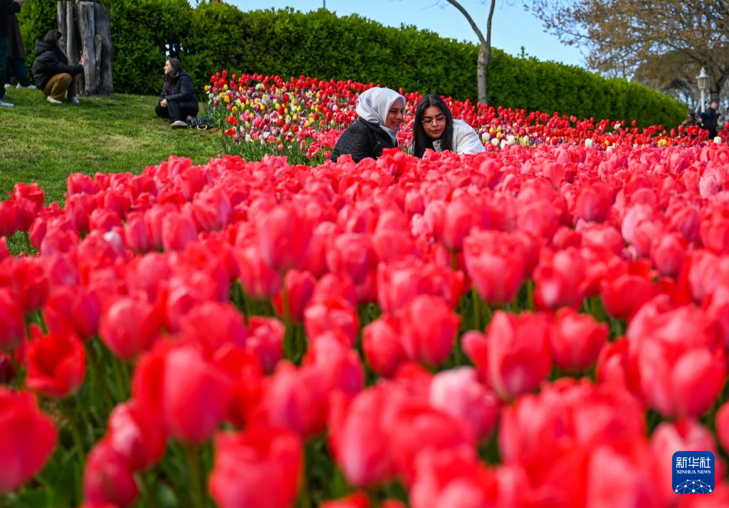 4月11日,在土耳其伊斯坦布尔,游客在埃米尔安公园的郁金香花丛中拍照。