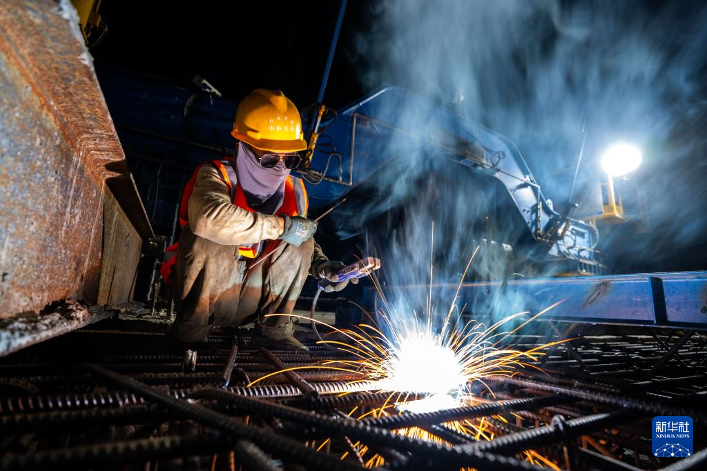 4月13日凌晨,在邵永高铁刘家院子跨二广高速特大桥建设工地,中铁五局工人在进行连续梁合龙施工。