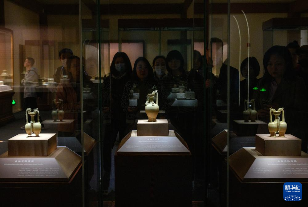 这是展出的白釉兽面纹双系扁壶(4月13日摄)。