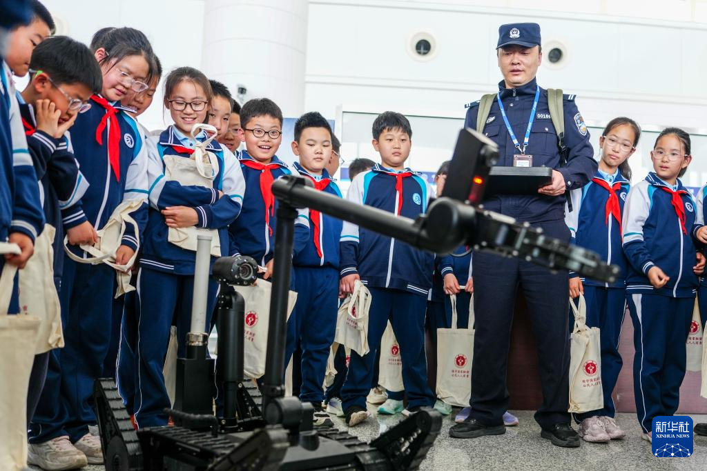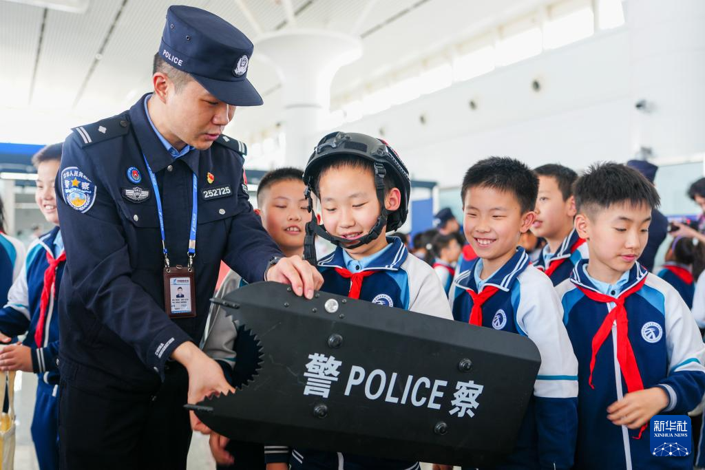 4月13日,在济南国际机场,学生在活动现场观摩警用装备。