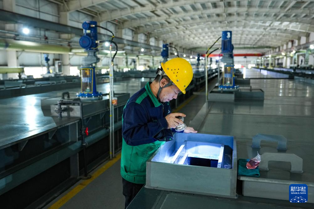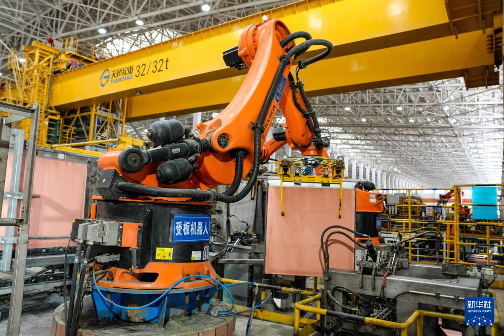 4月14日,在金川集团永昌铜业有限公司精炼分厂,受板机器人在进行剥片作业。