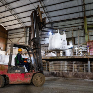 4月13日,在金昌神泥科技有限公司原料仓,工作人员进行废渣投料作业。