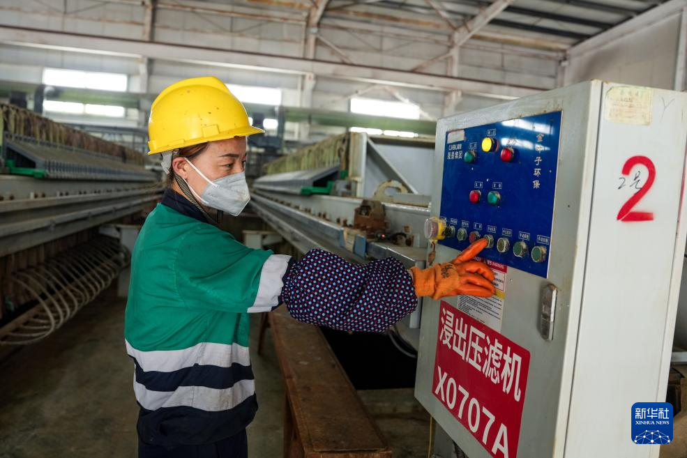 4月13日,在金昌神泥科技有限公司浸出车间,工作人员操作压滤机进行压滤作业。